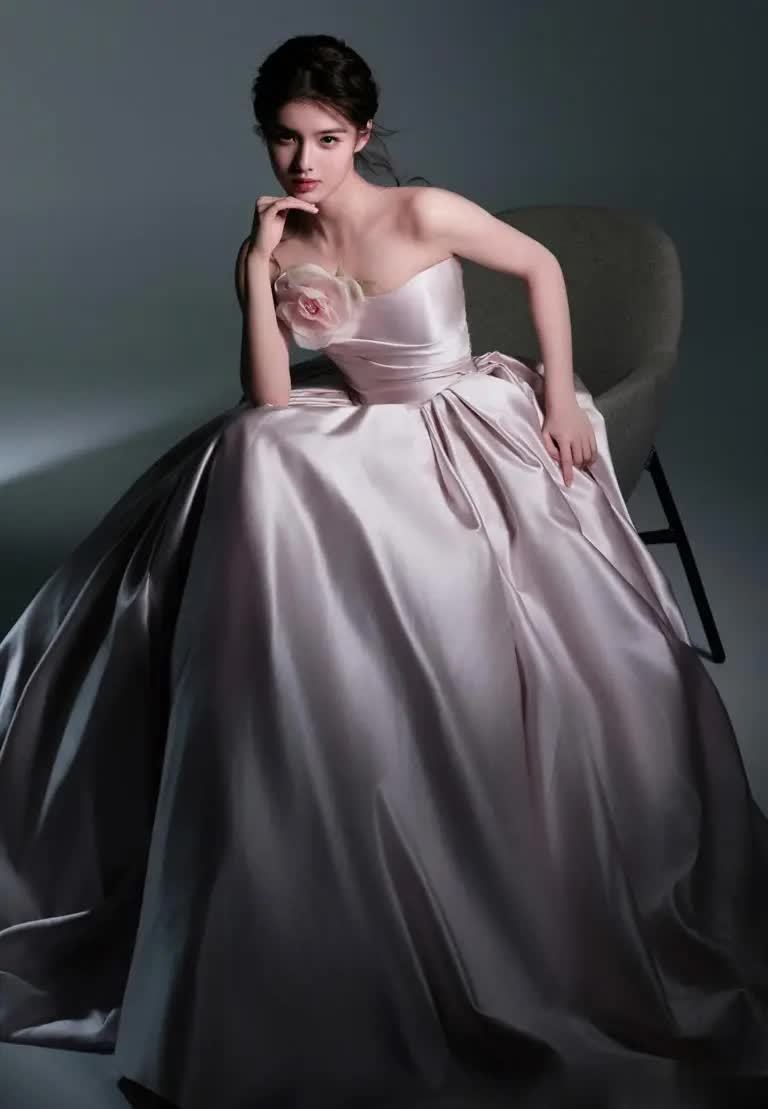 淡粉缎面裙身以利落剪裁勾勒柔美腰线,大裙摆层层叠叠如花瓣绽放,行走间暗香浮动。肩头薄纱立体玫瑰是点睛之笔,雾感花瓣与缎面光泽碰撞出柔与刚的平衡,温柔却不张扬,自带高级气场。没有浓妆堆砌,清透感贯穿整体造型,同色系搭配和谐统一,像春日里悄然盛放的玫瑰,不疾不徐却让人移不开眼。光影里她静立倚靠,每个姿态都与裙装温柔契合,盘发利落与碎发随性互补,中和了抹胸裙的优雅与少女灵动,眼波间藏着青涩与沉淀的气质,细节处的精致巧思,恰如她的成长,以温柔力量悄然绽放专属光芒。
